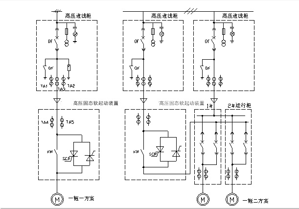 当电机达到全速运行后,电机电流降到正常全速运行的电流值,NRRQV系列软起动装置有一个旁路输出继电器,从而使旁路高压真空接触器闭合,使电机电流经旁路接触器,防止SCR导通所产生的压降引起的热损耗,提高了工作效率及可靠性。如图(1)所示。