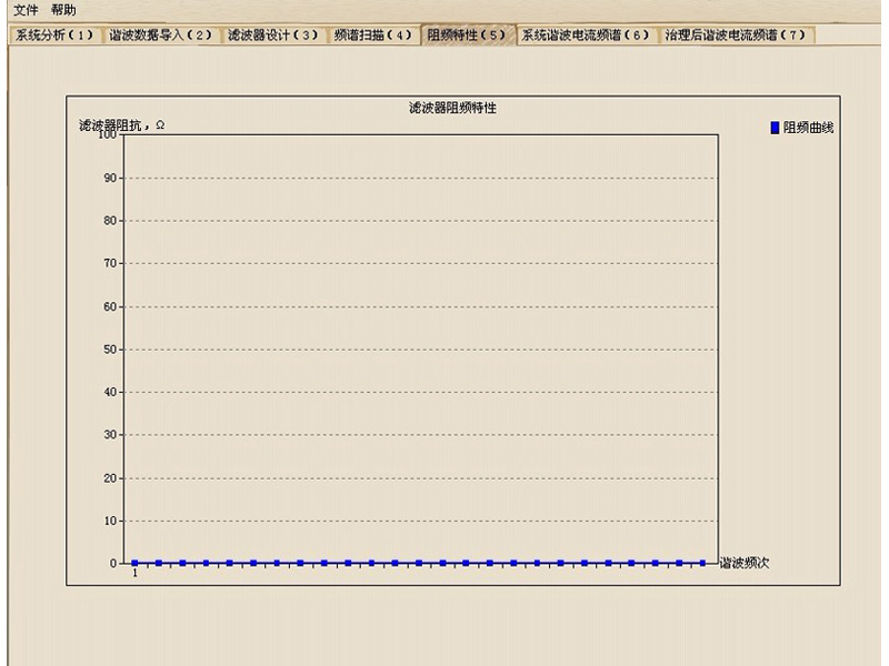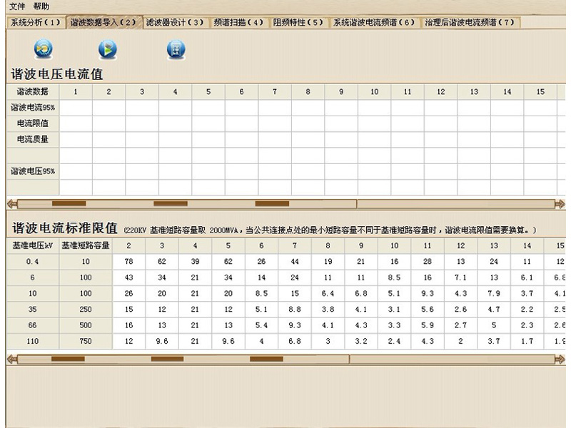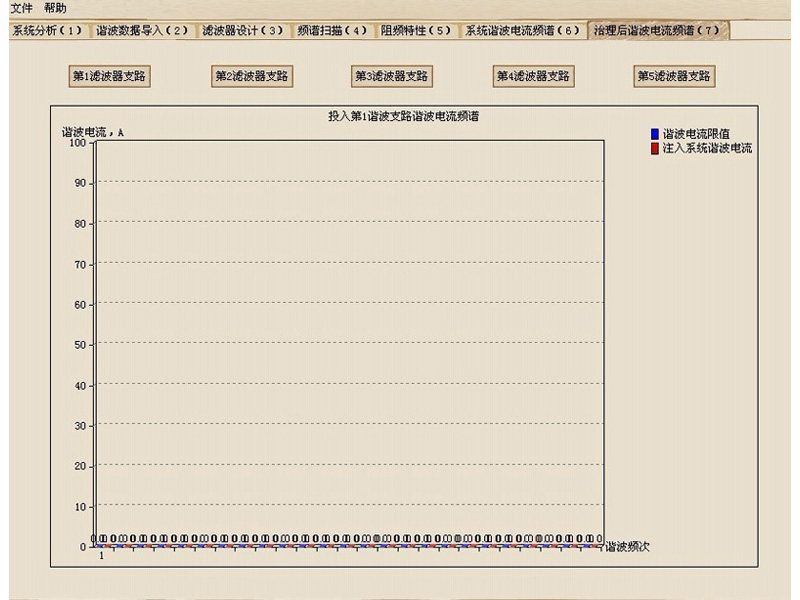 据导入”“滤波器设计”“频谱扫描”“阻频特性”“系统谐波电流频谱”“治理后谐波电流频谱”,按序号1——7分别执行。