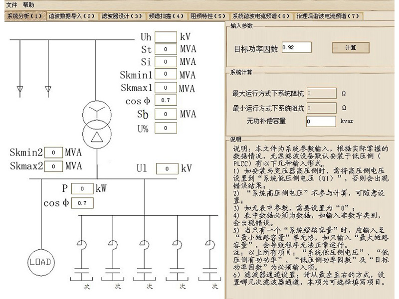 注:Ul为滤波器安装侧母线电压值,必须输入,如果滤波器安装于变压器高压侧,则将把安装侧的短路容量、电压、有功功率、功率因数输入到图中低压侧数据中。