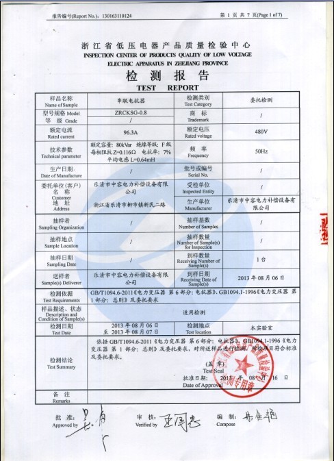 6.电抗器能在工频加谐波电流不大于1.35倍额定电流下长期运行。